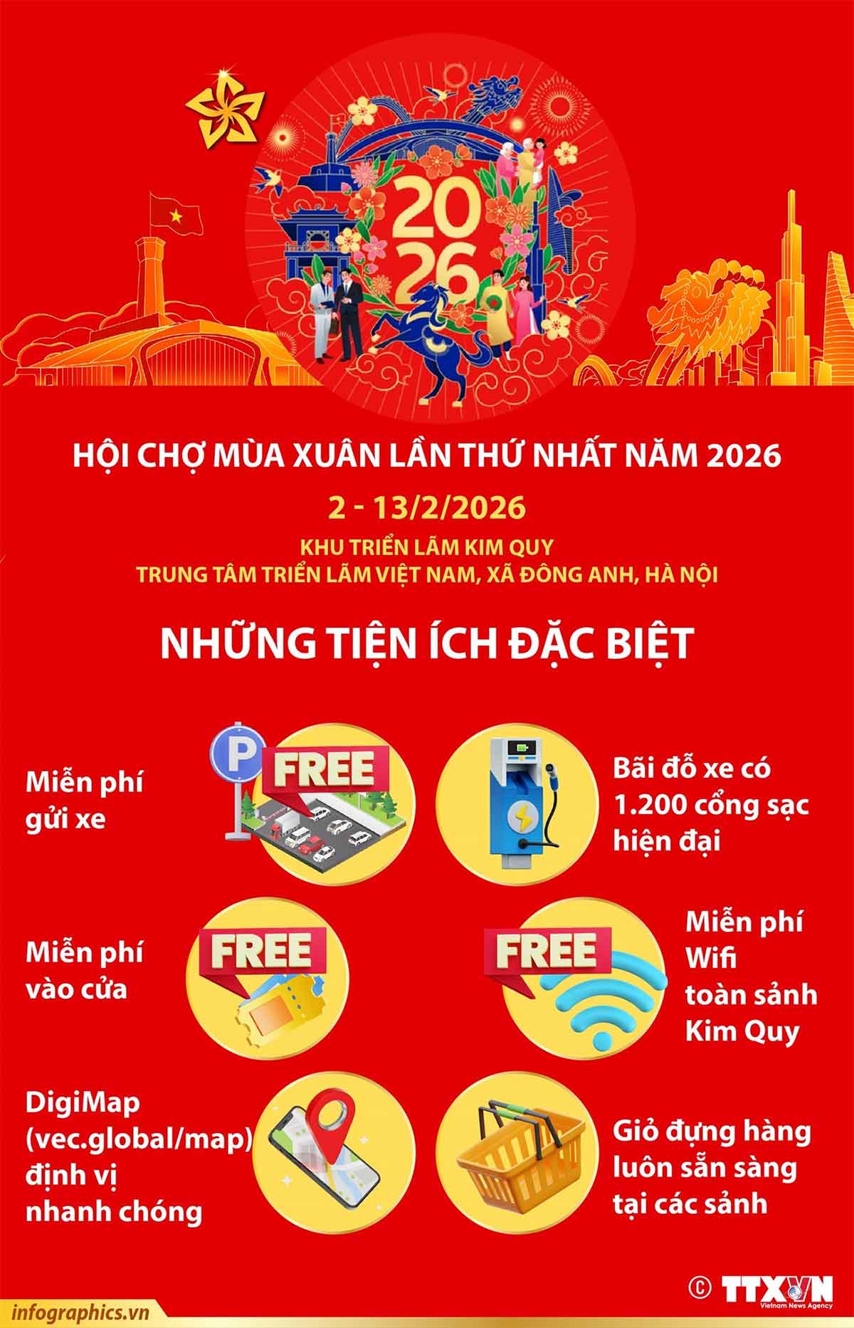 Hội chợ mùa Xuân lần thứ nhất năm 2026, với chủ đề “Kết nối thịnh vượng - Đón xuân huy hoàng,” diễn ra từ ngày 2-13/2/2026, tại Trung tâm Triển lãm Việt Nam, xã Đông Anh, Hà Nội.