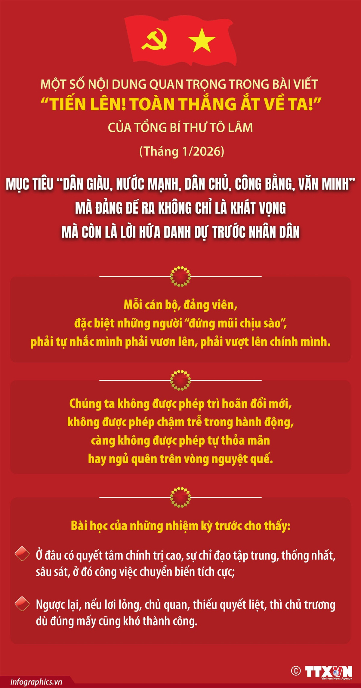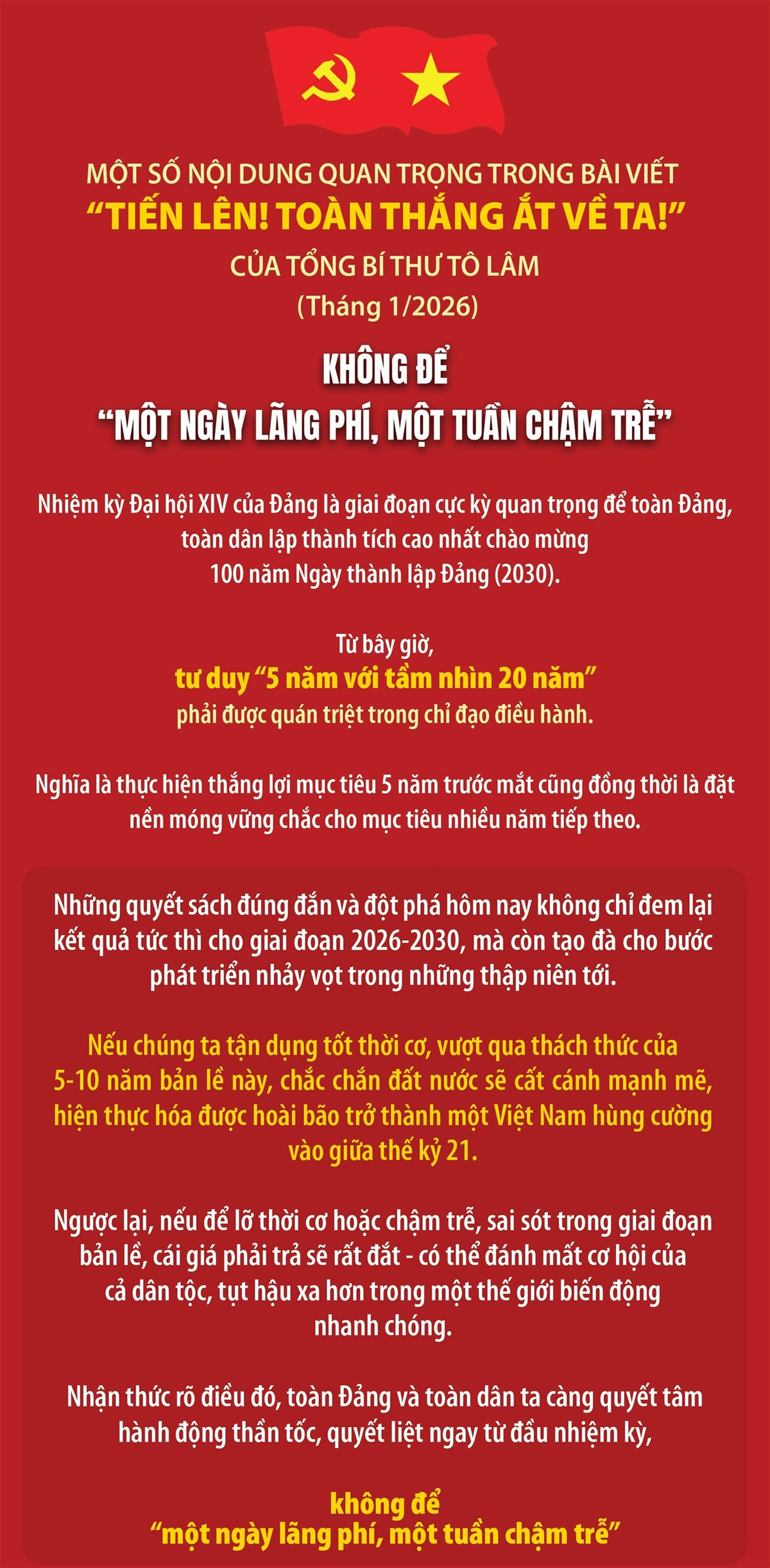 Trong bài viết: “Tiến lên! Toàn thắng ắt về ta!” viết tháng 1/2026, Tổng Bí thư Tô Lâm khẳng định: Nhiệm kỳ Đại hội XIV của Đảng là giai đoạn cực kỳ quan trọng để toàn Đảng, toàn dân lập thành tích cao nhất chào mừng 100 năm Ngày thành lập Đảng (2030).