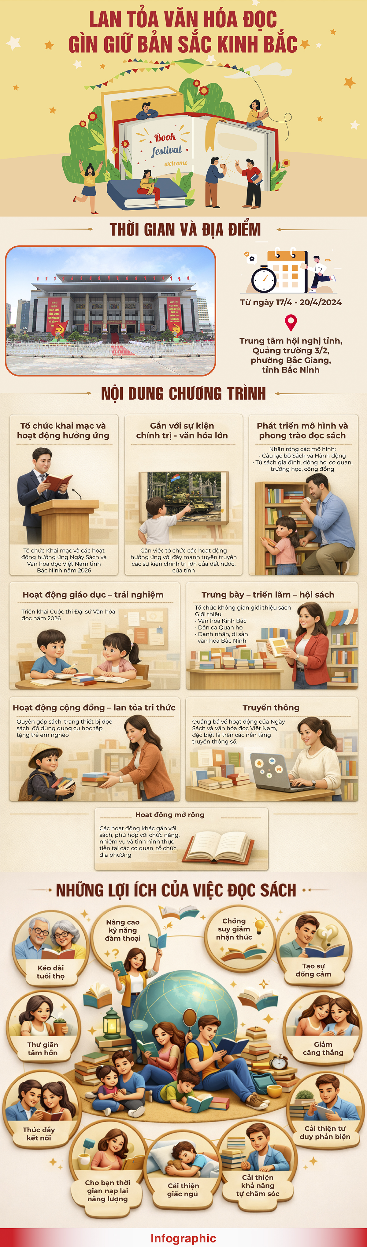 BẮC NINH - Sự kết nối hài hòa giữa tri thức và nghệ thuật, giữa đọc sách và sáng tạo là điểm nhấn tại Ngày Sách và Văn hóa đọc tại tỉnh Bắc Ninh năm nay. Qua các cuộc thi: Vẽ tranh theo sách, Đại sứ Văn hóa đọc và trưng bày tài liệu quý, Bắc Ninh đang hiện thực hóa mục tiêu xây dựng môi trường giáo dục nhân văn, đậm đà bản sắc Kinh Bắc. Dưới đây là các hoạt động chính của Ngày Sách và Văn hóa đọc năm 2026 tại tỉnh Bắc Ninh.