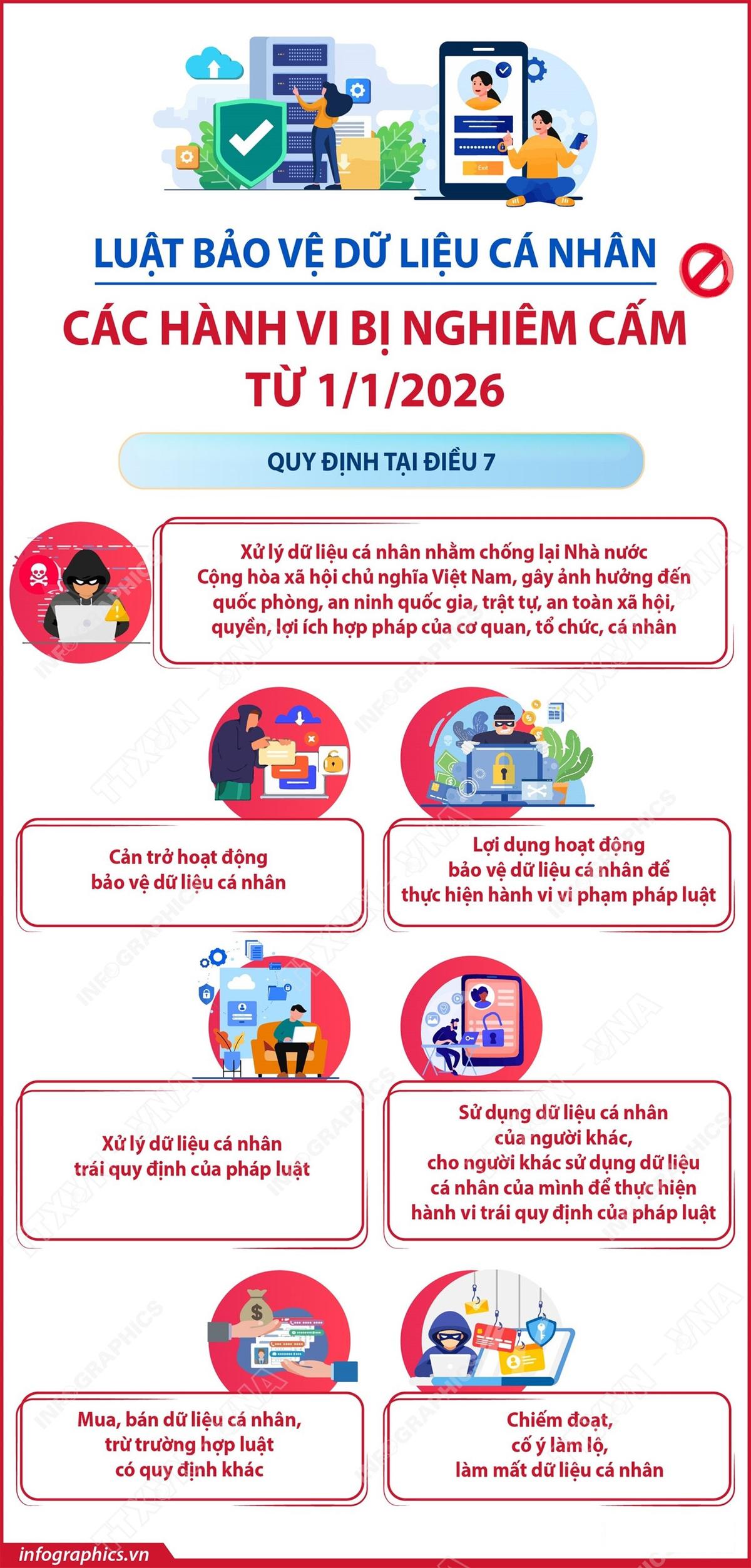 Theo quy định tại Điều 7 Luật Bảo vệ Dữ liệu cá nhân, từ 1/1/2026, các hành vi bị nghiêm cấm gồm xử lý dữ liệu cá nhân nhằm chống lại Nhà nước Cộng hòa xã hội chủ nghĩa Việt Nam, gây ảnh hưởng đến quốc phòng, an ninh quốc gia, trật tự, an toàn xã hội, quyền, lợi ích hợp pháp của cơ quan, tổ chức, cá nhân; Cản trở hoạt động bảo vệ dữ liệu cá nhân; Lợi dụng hoạt động bảo vệ dữ liệu cá nhân để thực hiện hành vi vi phạm pháp luật; Xử lý dữ liệu cá nhân trái quy định của pháp luật; Sử dụng dữ liệu cá nhân của người khác, cho người khác sử dụng dữ liệu cá nhân của mình để thực hiện hành vi trái quy định của pháp luật; Mua, bán dữ liệu cá nhân, trừ trường hợp luật có quy định khác và Chiếm đoạt, cố ý làm lộ, làm mất dữ liệu cá nhân.