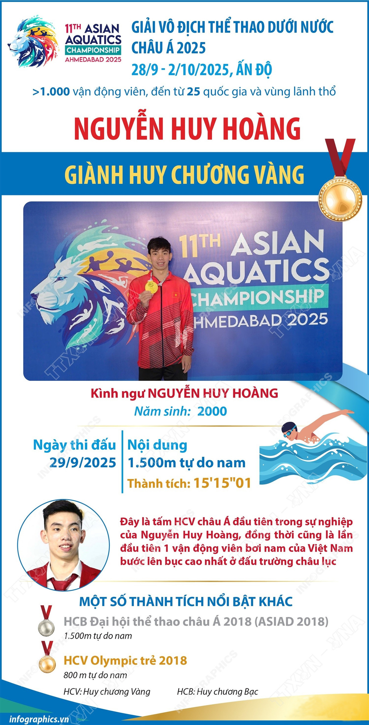 Ngày 29/9/2025, tại Giải vô địch thể thao dưới nước châu Á 2025, tổ chức từ ngày 28/9 - 2/10/2025 tại thành phố Ahmedabad (Ấn Độ), kình ngư Nguyễn Huy Hoàng đã xuất sắc giành Huy chương Vàng ở chung kết nội dung 1.500m tự do do nam. Đây là lần đầu tiên trong lịch sử, bơi lội Việt Nam bước lên ngôi vô địch châu lục ở một nội dung sở trường vốn chỉ dành cho những cường quốc như Trung Quốc, Nhật Bản hay Hàn Quốc.