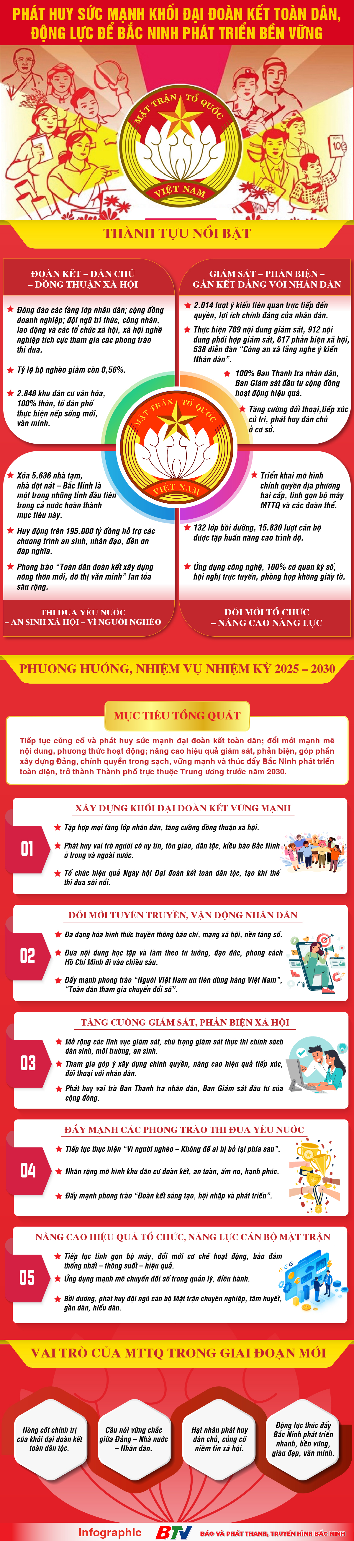 BẮC NINH - Đại hội đại biểu MTTQ Việt Nam tỉnh Bắc Ninh lần thứ I, nhiệm kỳ 2025 - 2030 là sự kiện chính trị trọng đại, thể hiện ý chí, niềm tin và khát vọng đoàn kết của các tầng lớp Nhân dân trong tỉnh. Đại hội khẳng định vai trò nòng cốt của MTTQ trong củng cố khối đại đoàn kết toàn dân, góp phần xây dựng tỉnh Bắc Ninh phát triển nhanh, bền vững, hướng tới trở thành thành phố trực thuộc Trung ương trước năm 2030.