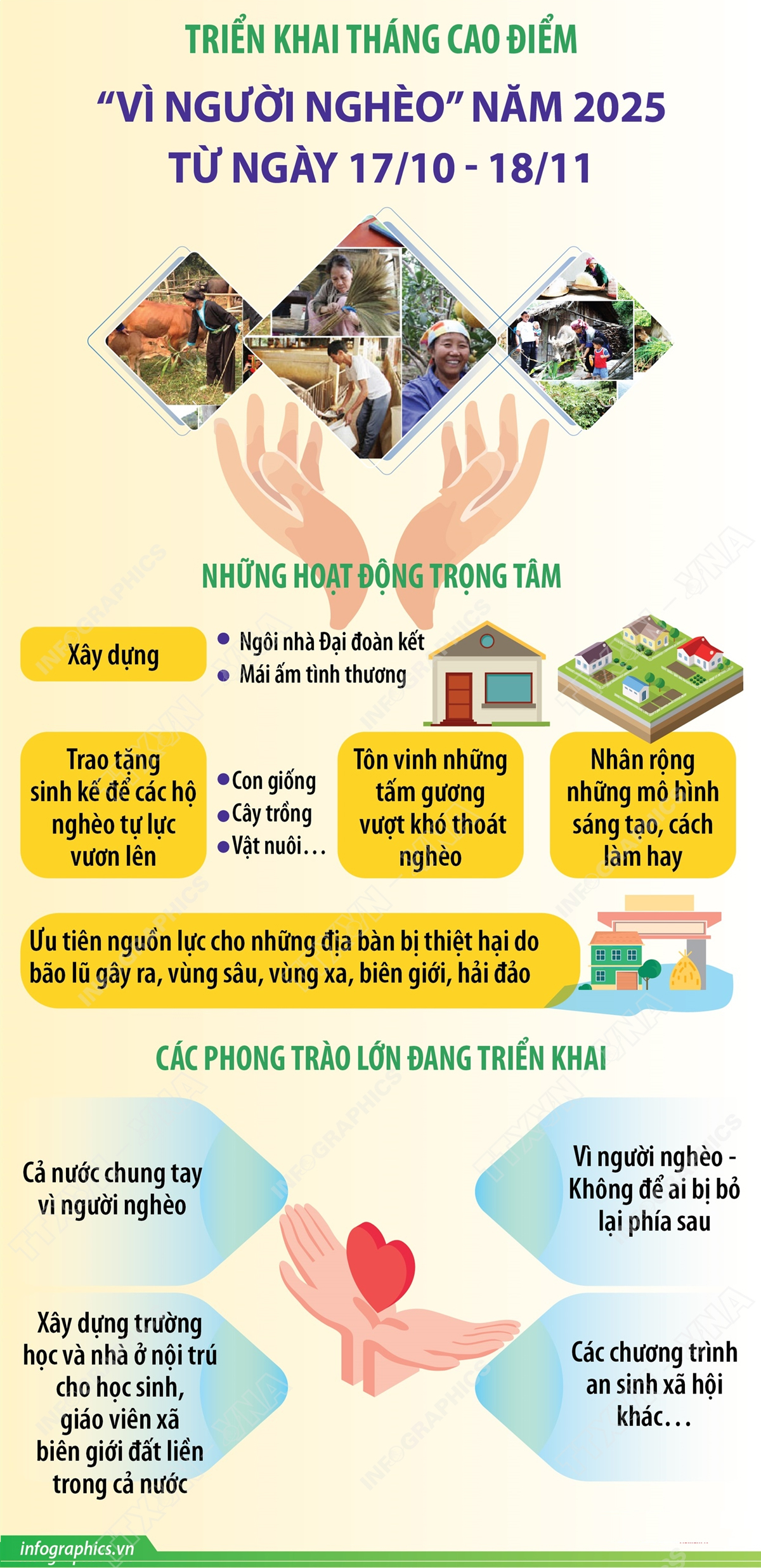 Hơn cả việc trao tặng những món quà vật chất, Tháng cao điểm “Vì người nghèo” năm 2025 tập trung vào việc tạo ra những giá trị bền vững. Đó là hỗ trợ xây dựng những “Ngôi nhà Đại đoàn kết”, “Mái ấm tình thương” kiên cố; trao tặng sinh kế, con giống, cây trồng để các hộ nghèo có thể tự lực vươn lên; tôn vinh những tấm gương vượt khó thoát nghèo, những mô hình sáng tạo, cách làm hay trong công tác giảm nghèo để nhân lên những giá trị tích cực trong cộng đồng. Tháng "Vì người nghèo" năm 2025 cũng ưu tiên nguồn lực cho những địa bàn bị thiệt hại do bão lũ gây ra, vùng sâu, vùng xa, vùng biên giới, hải đảo…