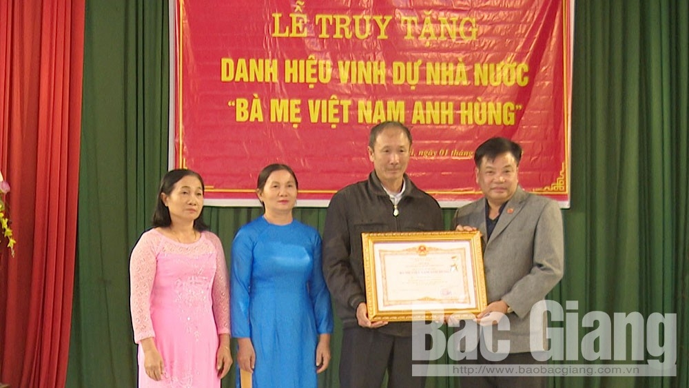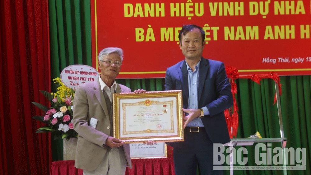 (BGĐT) - UBND xã Hồng Thái (Việt Yên) vừa tổ chức lễ truy tặng danh hiệu “Bà mẹ Việt Nam Anh hùng” cho mẹ Nguyễn Thị Nhàn, xã Hồng Thái. Dự buổi lễ có đồng chí Nguyễn Đại Lượng, Phó Chủ tịch UBND huyện.
