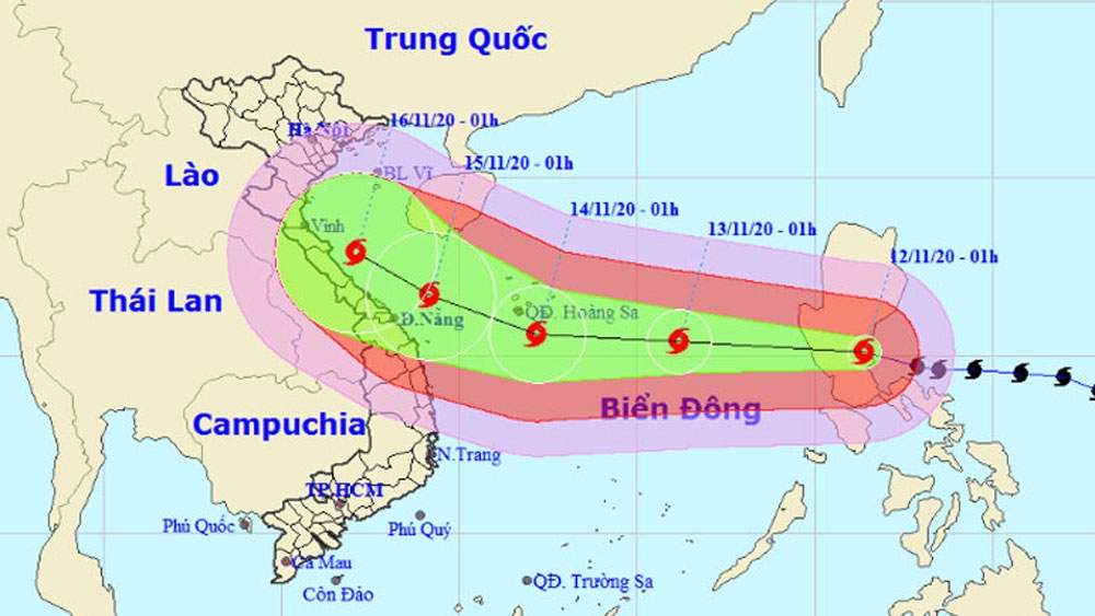 Dự báo từ 4 giờ ngày 13/11 đến 4 giờ ngày 14/11, bão số 13 di chuyển theo hướng Tây, mỗi giờ đi được 15-20 km. Đến 4 giờ ngày 14/11, vị trí tâm bão ở khoảng 15,5 độ Vĩ Bắc; 111,9 độ Kinh Đông, trên vùng biển phía Nam của Quần đảo Hoàng Sa. Sức gió mạnh nhất vùng gần tâm bão mạnh cấp 12 (115-135 km/giờ), giật cấp 15.