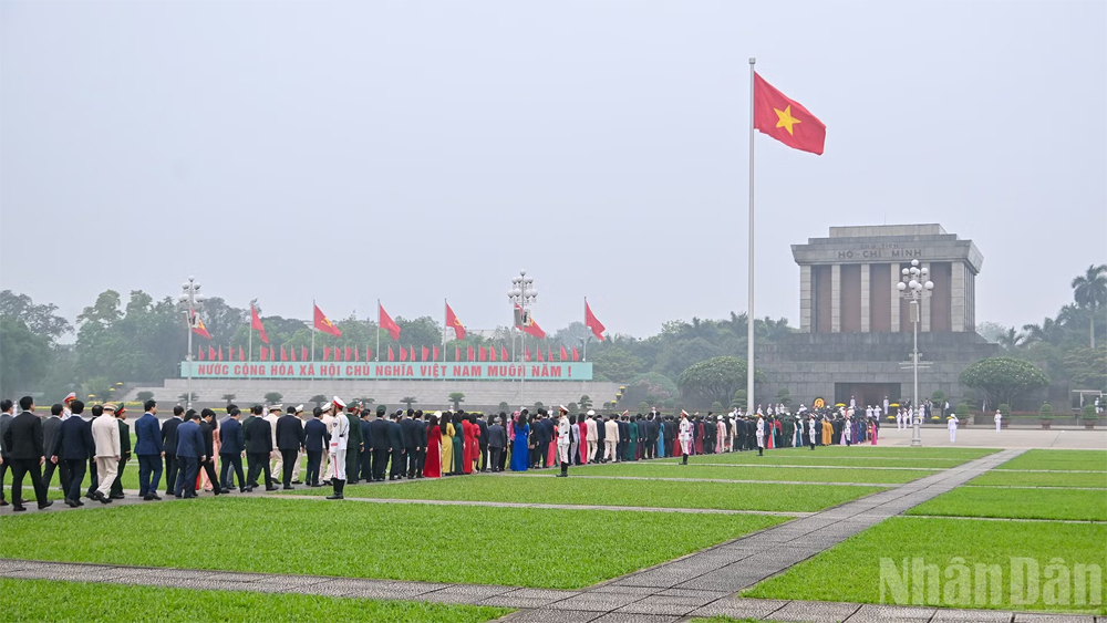 Đúng 7 giờ sáng, Đoàn đại biểu Quốc hội, do Tổng Bí thư Tô Lâm, Chủ tịch nước Lương Cường, Thủ tướng Phạm Minh Chính, Chủ tịch Quốc hội Trần Thanh Mẫn cùng các đồng chí lãnh đạo Đảng, Nhà nước dẫn đầu, xuất phát từ đường Bắc Sơn vào Lăng viếng Chủ tịch Hồ Chí Minh. |