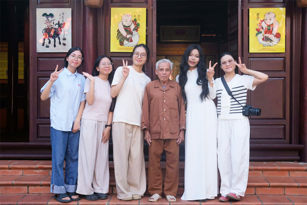 Nhóm sinh viên cùng nghệ nhân Nguyễn Đăng Chế tại làng tranh Đông Hồ. |