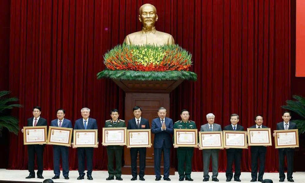 Tổng Bí thư Tô Lâm trao tặng Huân chương Độc lập hạng Nhất, Nhì, Ba và Huân chương Quân công hạng Nhì, Ba cho các đồng chí lãnh đạo. Ảnh: TTXVN |