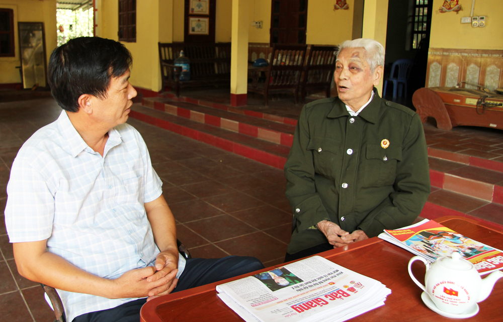 Cựu chiến binh Nguyễn Văn Sơn (bên phải) kể về Sư đoàn 349 đóng tại Trại Cờ. |