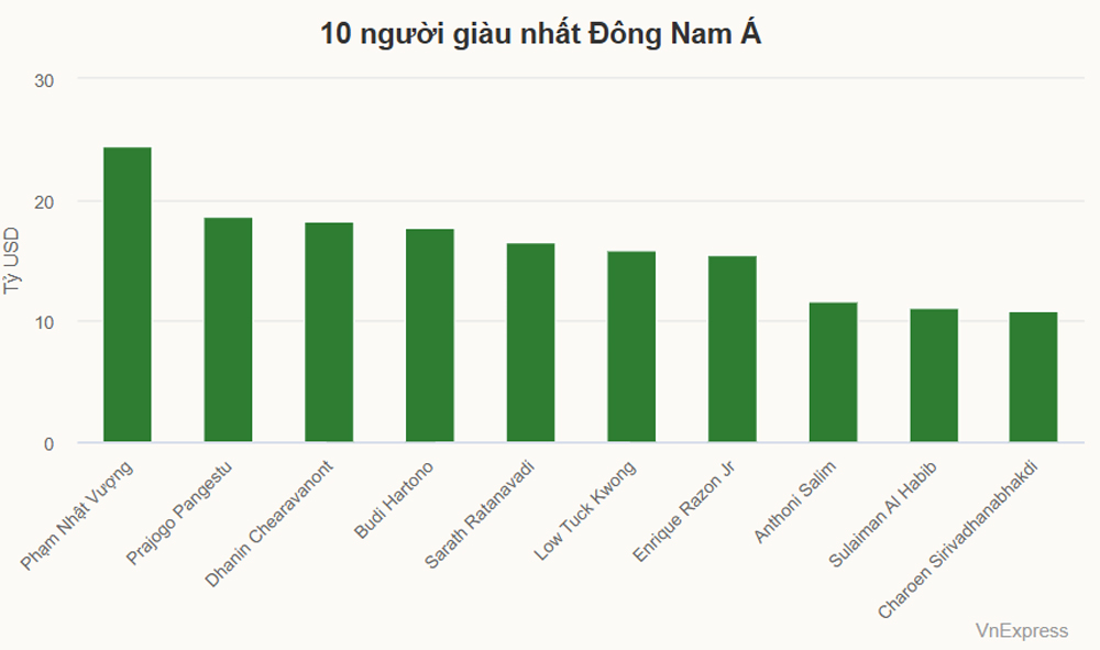 Theo bảng xếp hạng tỷ phú theo thời gian thực của Forbes, tính đến ngày 5/4, ông Phạm Nhật Vượng sở hữu khối tài sản 24,5 tỷ USD, xếp thứ 100 trên thế giới về độ giàu có. Như vậy, tỷ phú này đã vượt ông Prajogo Pangestu, người Indonesia, nhà sáng lập tập đoàn Barito Pacific, để trở thành người giàu nhất Đông Nam Á.