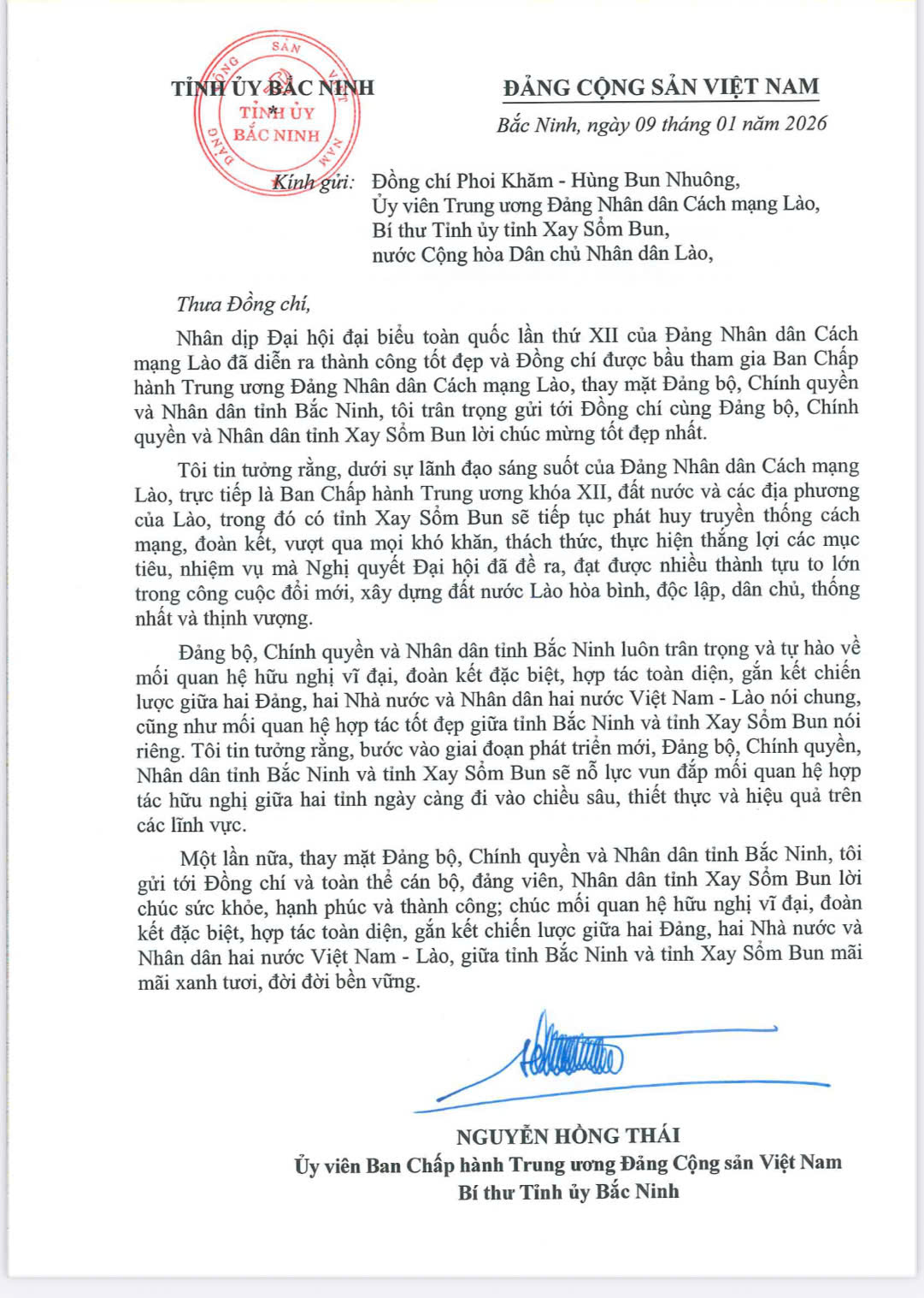 BẮC NINH - Nhân dịp Đại hội Đảng Nhân dân Cách mạng Lào lần thứ XII diễn ra thành công tốt đẹp, đồng chí Nguyễn Hồng Thái, Uỷ viên Ban Chấp hành Trung ương Đảng, Bí thư Tỉnh ủy Bắc Ninh đã gửi thư chúc mừng tới Đồng chí Phoi Khăm - Hùng Bun Nhuông, Uỷ viên Trung ương Đảng Nhân dân Cách mạng Lào, Bí thư Tỉnh ủy tỉnh Xay Sổm Bun và đồng chí Phút Phăn Kẹo Vông Xay, Uỷ viên Trung ương Đảng Nhân dân Cách mạng Lào, Bí thư Tỉnh ủy tỉnh Hủa Phăn.