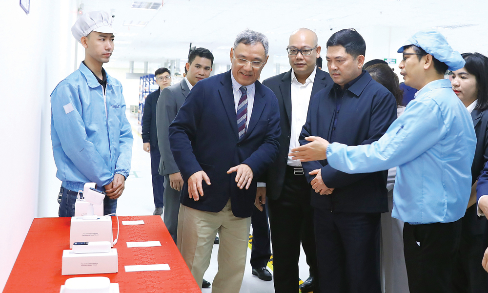 Đồng chí Nguyễn Hồng Thái thăm, nghe giới thiệu về các sản phẩm của Công ty trách nhiệm hữu hạn Khoa học kỹ thuật Fuhai, Khu công nghiệp Hòa Phú, xã Xuân Cẩm. Ảnh: Quốc Trường. |