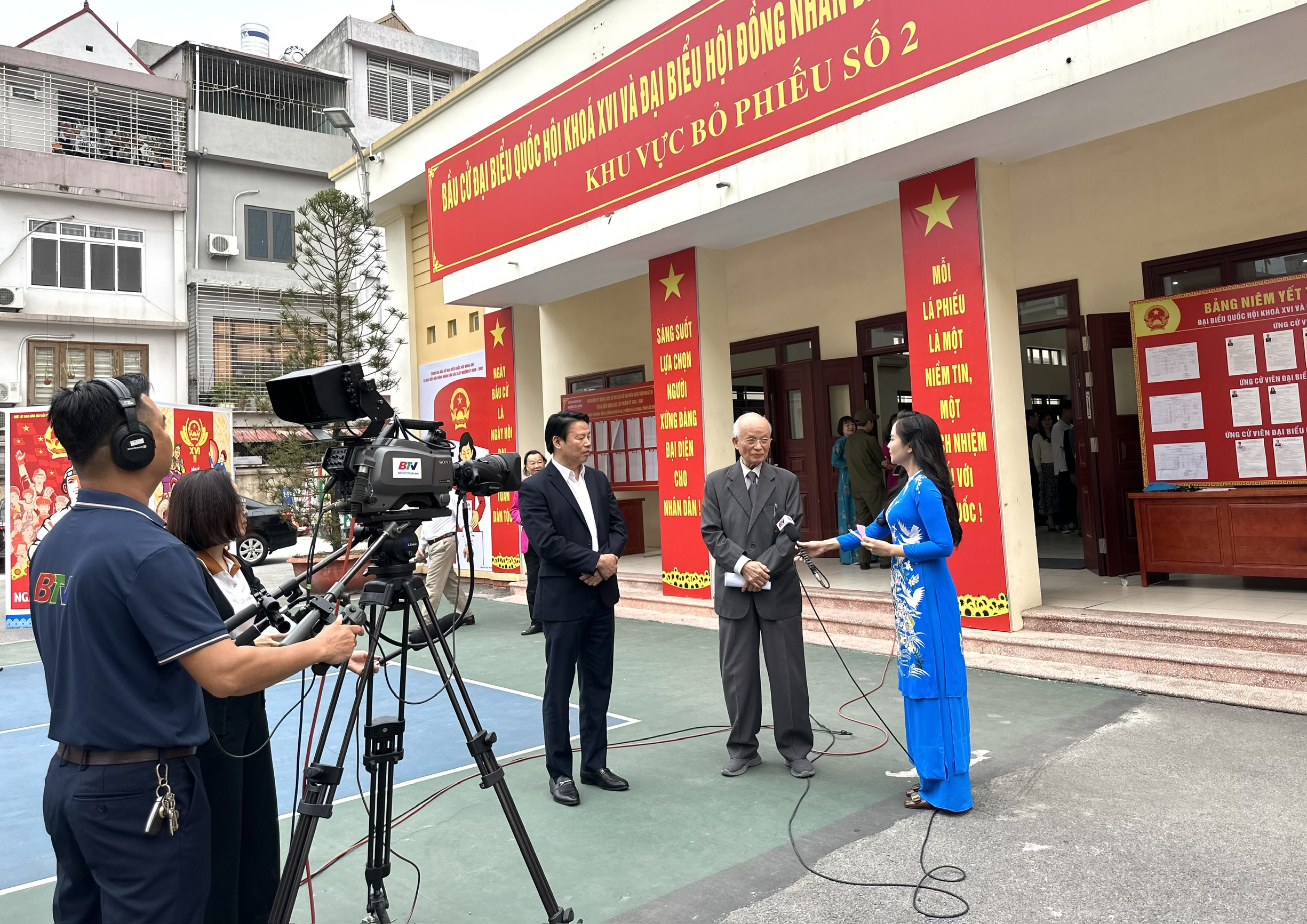 Đồng chí Đỗ Bình Dương, Nguyên Uỷ viên TƯ Đảng, nguyên Tổng Kiểm toán Nhà nước, nguyên Bí thư Tỉnh uỷ Bắc Giang trả lời phỏng vấn Báo và PTTH Bắc Ninh tại khu vực bỏ phiếu số 2, phường Bắc Giang. |