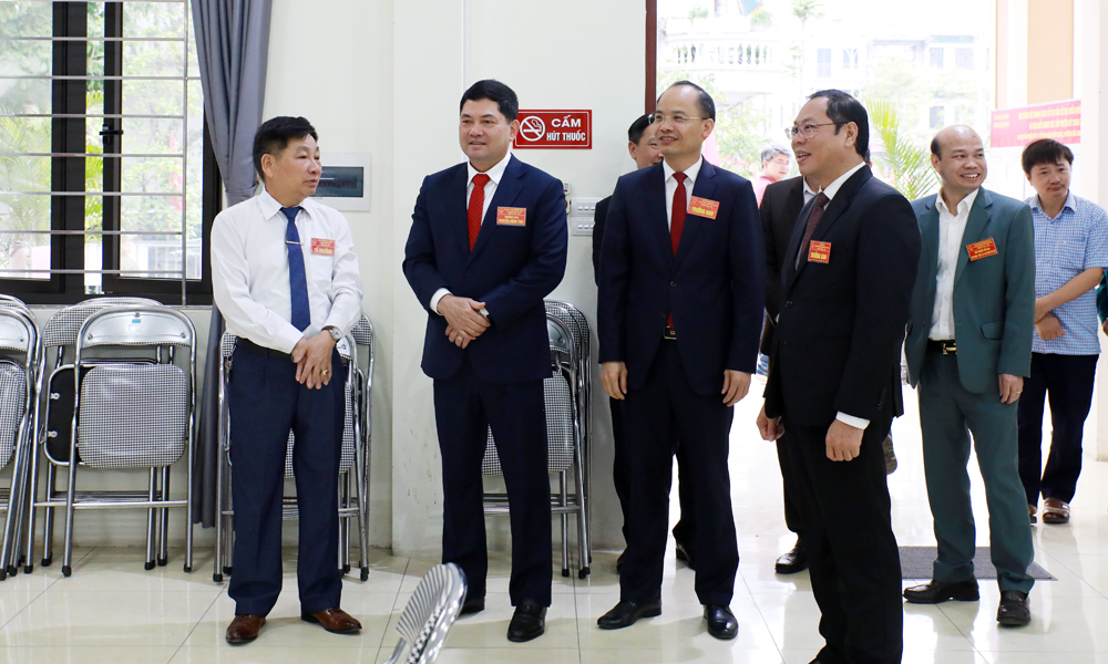 Đồng chí Nguyễn Hồng Thái kiểm tra công tác bầu cử tại Tổ bầu cử số 27, phường Bắc Giang. |