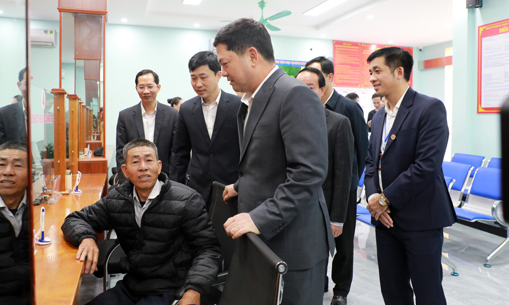 Bí thư Tỉnh ủy Nguyễn Hồng Thái và các thành viên trong đoàn thăm Trung tâm phục vụ hành chính công phường Cảnh Thụy. |