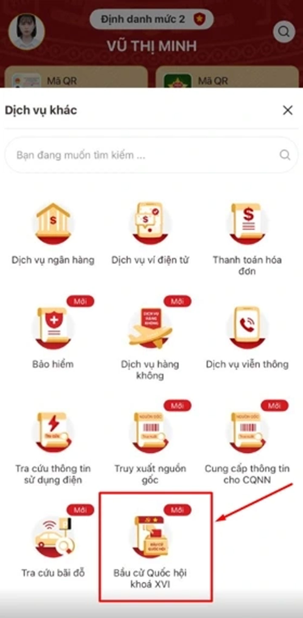 Bước 1: Truy cập chức năng Bầu cử Quốc hội khóa XVI. Công dân đăng nhập ứng dụng VNeID, tại màn hình trang chủ tài khoản định danh điện tử mức 2 nhấn Dịch vụ khác, nhấn Bầu cử Quốc hội khóa XVI.