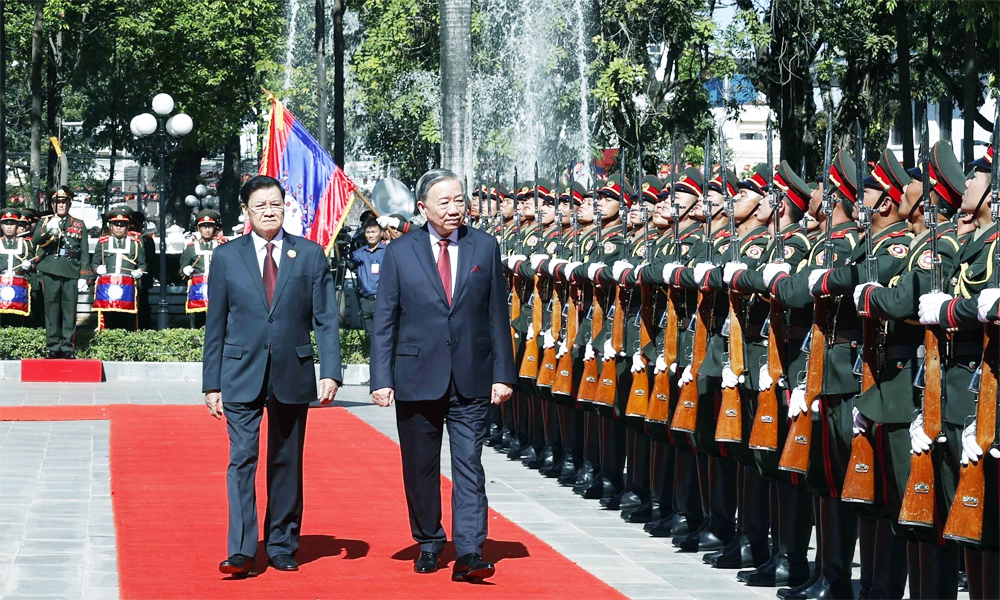 Tổng Bí thư, Chủ tịch nước Lào Thongloun Sisoulith và Tổng Bí thư Tô Lâm duyệt Đội danh dự Quân đội nhân dân Lào. (Ảnh: TTXVN) |