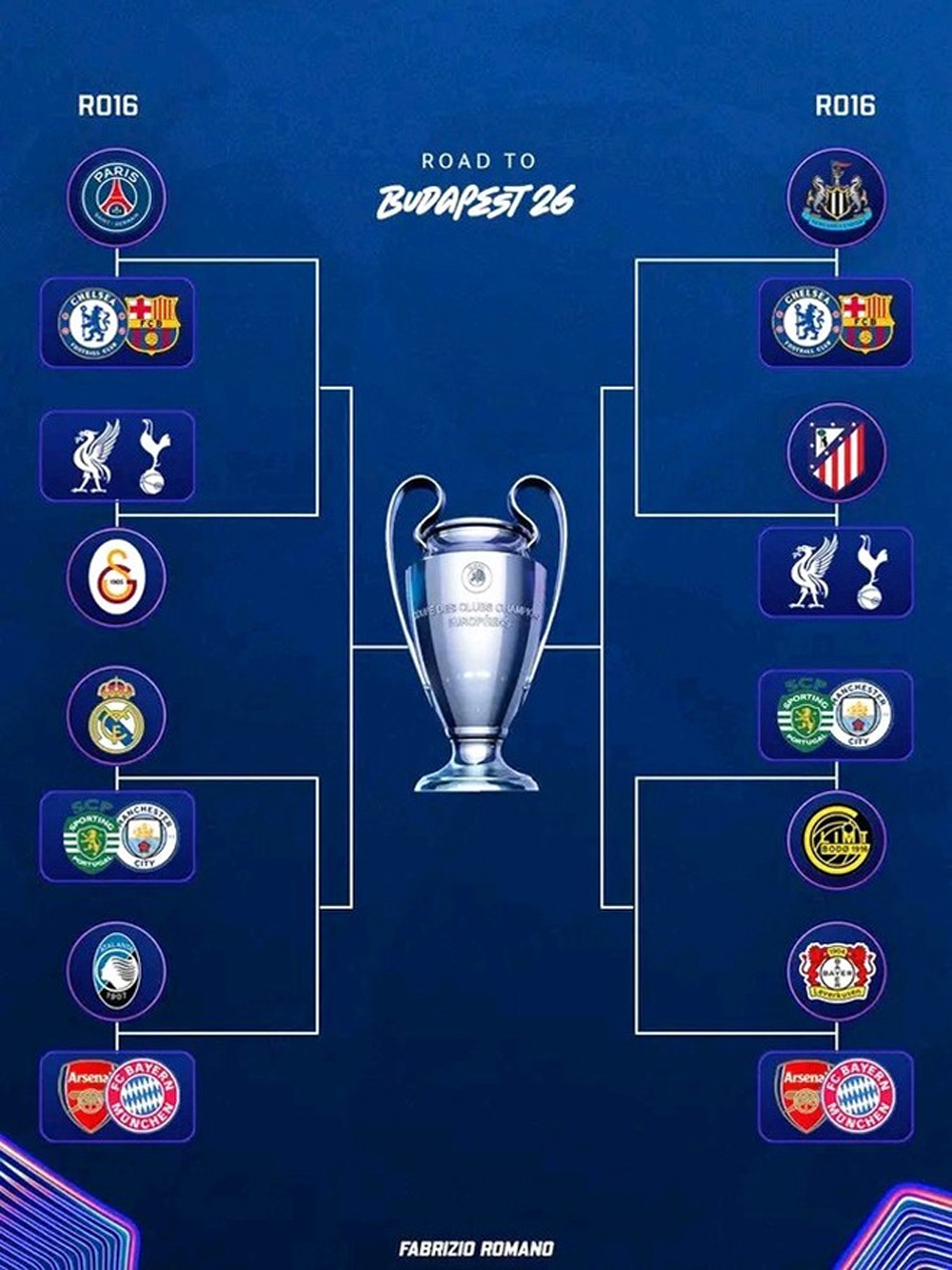 Galatasaray gặp Liverpool hoặc Tottenham. Atalanta sẽ so tài với Bayern Munich hoặc Arsenal. Newcastle gặp Barcelona hoặc Chelsea.