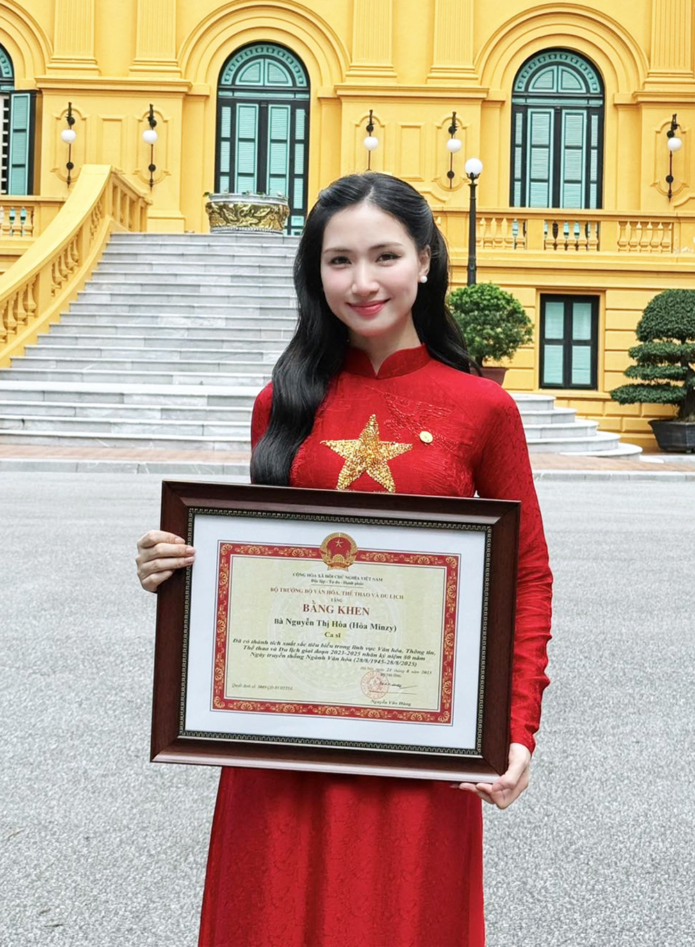 Hoà Minzy cùng ê-kíp nhận bằng khen của Chủ tịch UBND tỉnh Bắc Ninh (3/2025). |