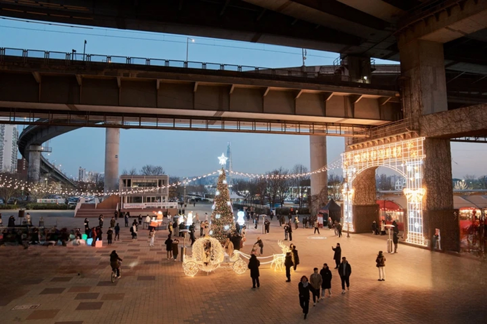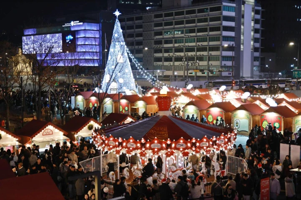 Trong hình là cảnh người dân bắt đầu đổ về chợ Giáng sinh Gwanghwamun tại quảng trường Gwanghwamun ở trung tâm Seoul để cùng nhau tham quan và trải nghiệm các hoạt động dành riêng cho ngày lễ này.