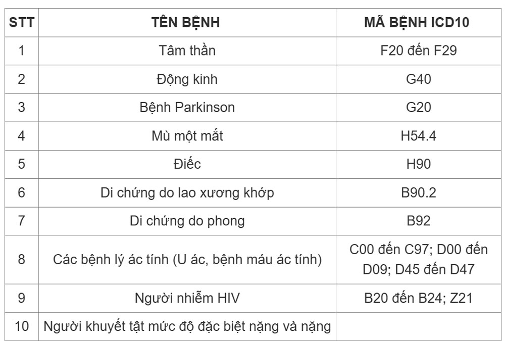 Theo đó, 10 bệnh thuộc diện miễn đăng ký nghĩa vụ quân sự, không nhận vào quân thường trực, gồm: