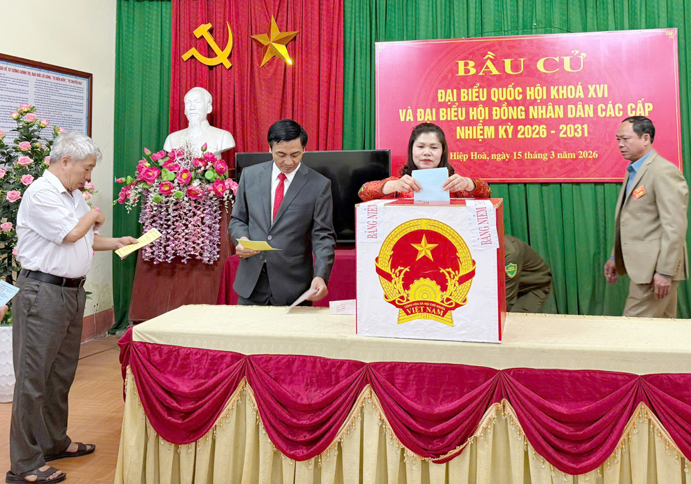 Đồng chí Lâm Thị Hương Thành bỏ phiếu bầu cử tại Tổ bầu cử số 1, xã Hiệp Hoà. |