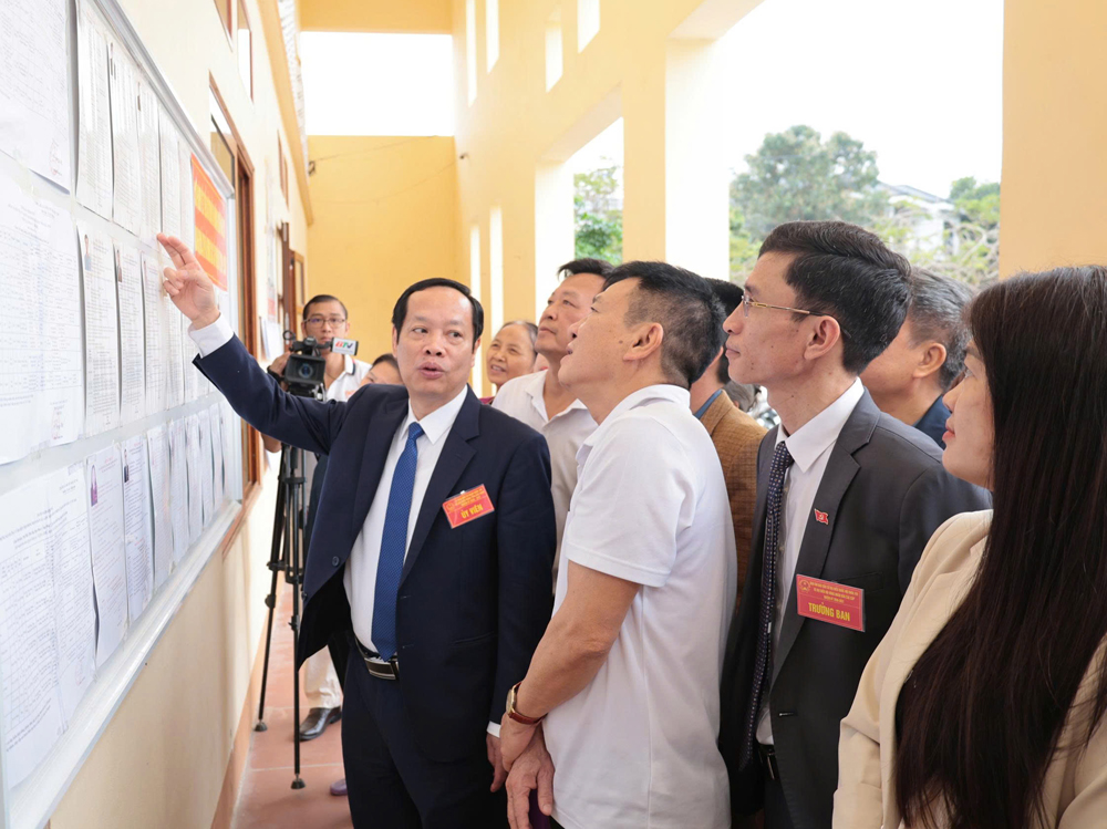 Đồng chí Nghiêm Xuân Hưởng kiểm tra khu vực niêm yết danh sách ứng cử viên đại biểu Quốc hội và đại biểu HĐND các cấp tại Tổ bầu cử số 2, đơn vị bầu cử số 15, thuộc thôn Đại Phú 1. |