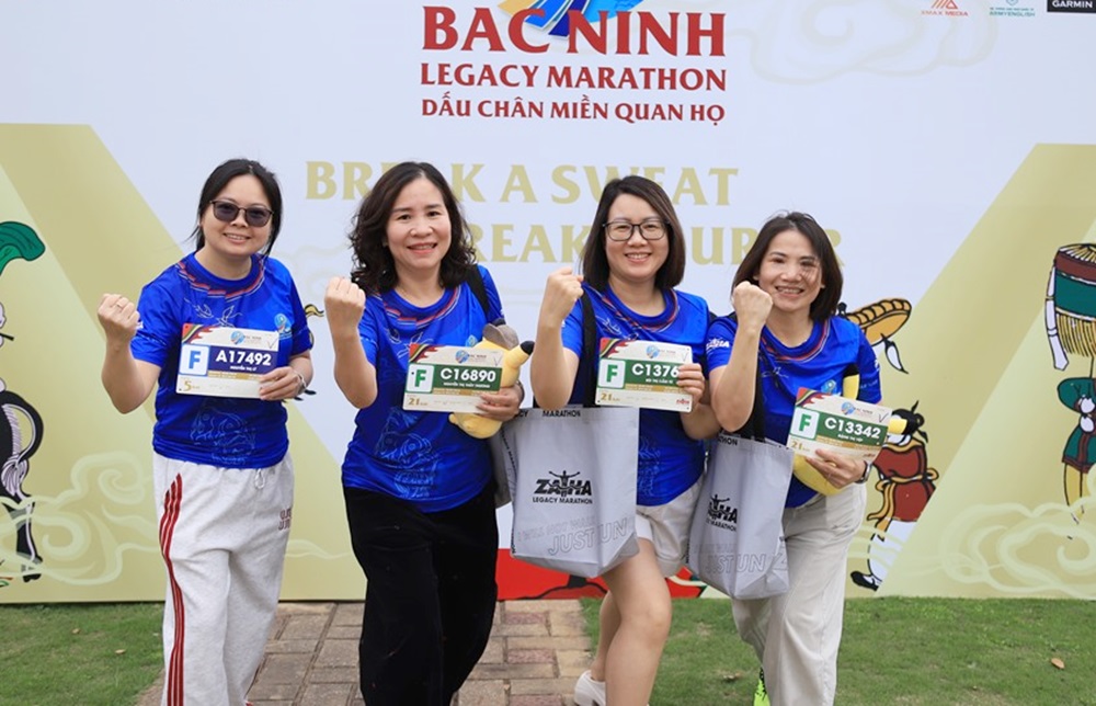 Nhóm nữ vận động viên phấn khởi check in tại khu vực giải chạy. |