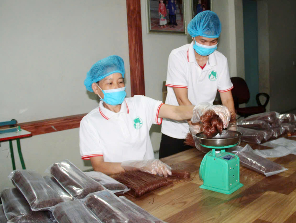 Thành viên HTX Mỳ sạch JVO Food Mỹ Thái (Lạng Giang) đóng gói sản phẩm đúng quy cách. |