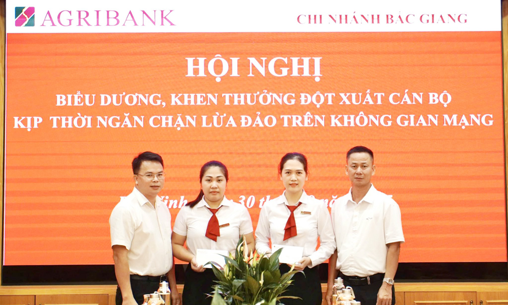 BẮC NINH- Ngân hàng Nông nghiệp và Phát triển nông thôn Việt Nam (Agribank) Chi nhánh Bắc Giang vừa tổ chức biểu dương, khen thưởng đột xuất 2 giao dịch viên Trần Thị Hoàng Yến và Triệu Ngọc Mai Phương đã phối hợp với các cán bộ khác trong phòng Kế toán Ngân quỹ và Công an phường Bắc Giang kịp thời ngăn chặn thành công vụ lừa đảo qua không gian mạng với số tiền hơn 800 triệu đồng.