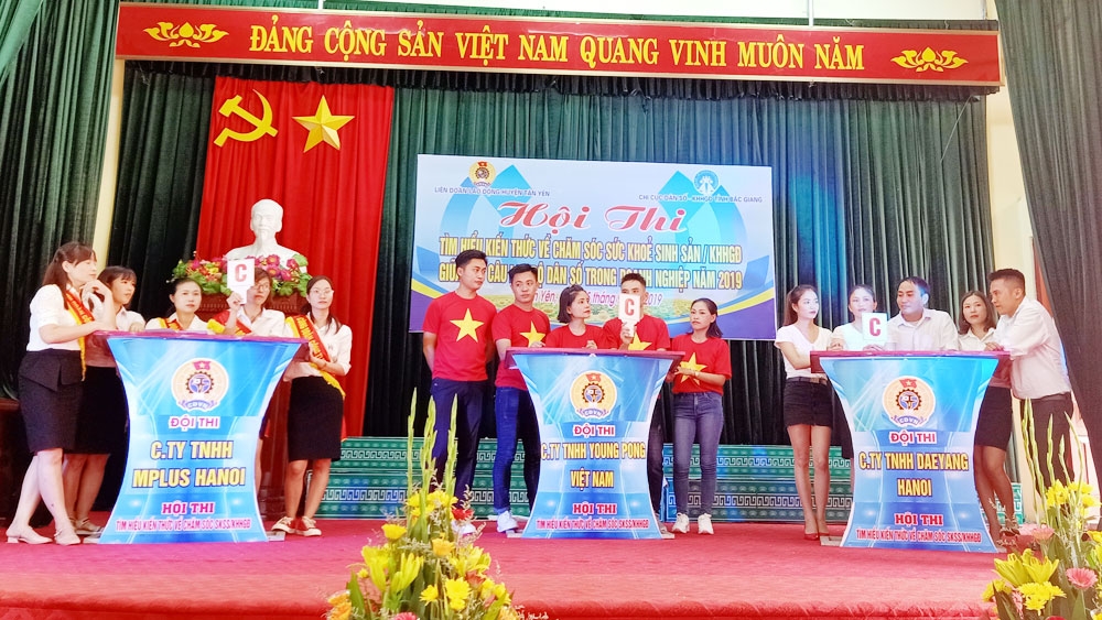 (BGĐT)- Sáng 15-9 tại Hội trường Khu hội nghị huyện Tân Yên (Bắc Giang) diễn ra hội thi tìm hiểu kiến thức về chăm sóc sức khỏe sinh sản và kế hoạch hoá gia đình (KHHGĐ) giữa các Câu lạc bộ (CLB) Dân số - Sức khỏe sinh sản trong doanh nghiệp (DN) huyện Tân Yên năm 2019. Hội thi do Chi cục Dân số - KHHGĐ phối hợp với Liên đoàn lao động huyện Tân Yên tổ chức.