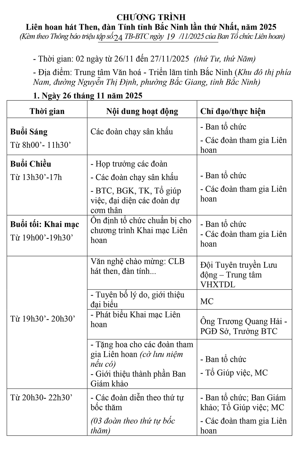 Liên hoan hát Then, đàn Tính tỉnh Bắc Ninh lần thứ Nhất năm 2025 sẽ diễn ra trong 2 ngày 26 - 27/11/2025 tại Trung tâm Văn hóa - Triển lãm tỉnh Bắc Ninh, với chuỗi hoạt động biểu diễn, giao lưu và chấm giải được tổ chức liên tục, quy củ và chuyên nghiệp.