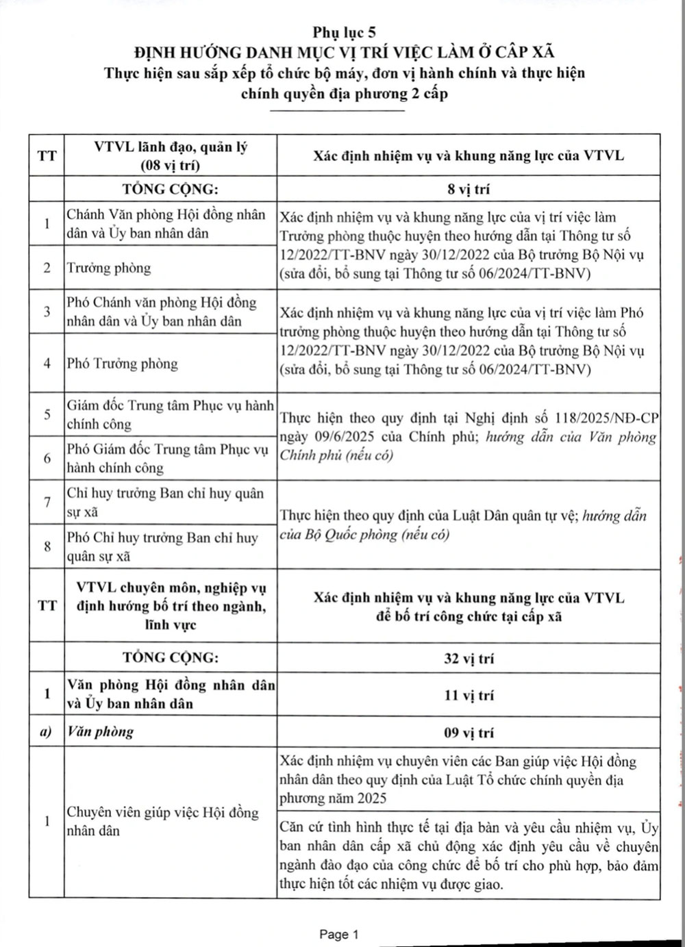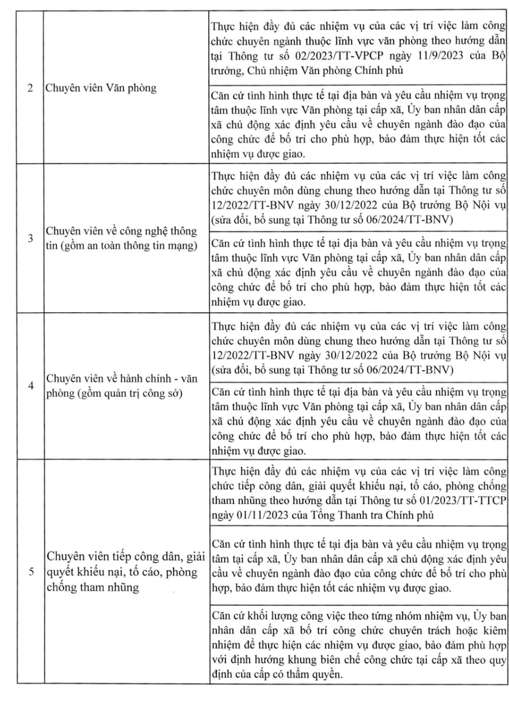 Bên cạnh đó, Bộ Nội vụ cũng định hướng 32 vị trí việc làm công chức chuyên môn, nghiệp vụ theo chức năng, nhiệm vụ của cấp xã mới.