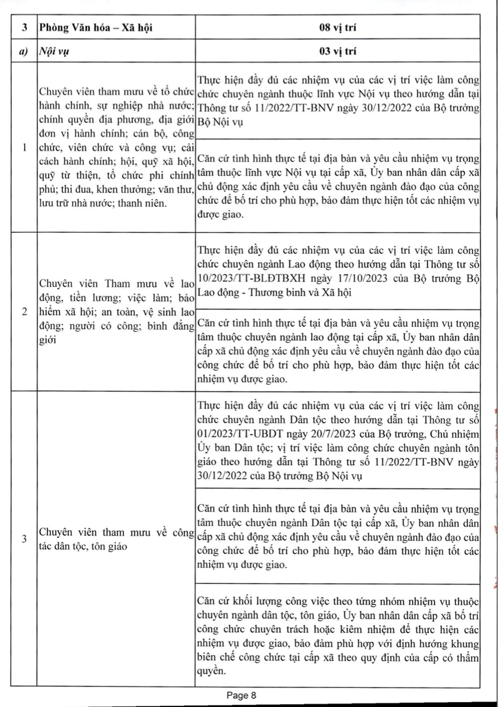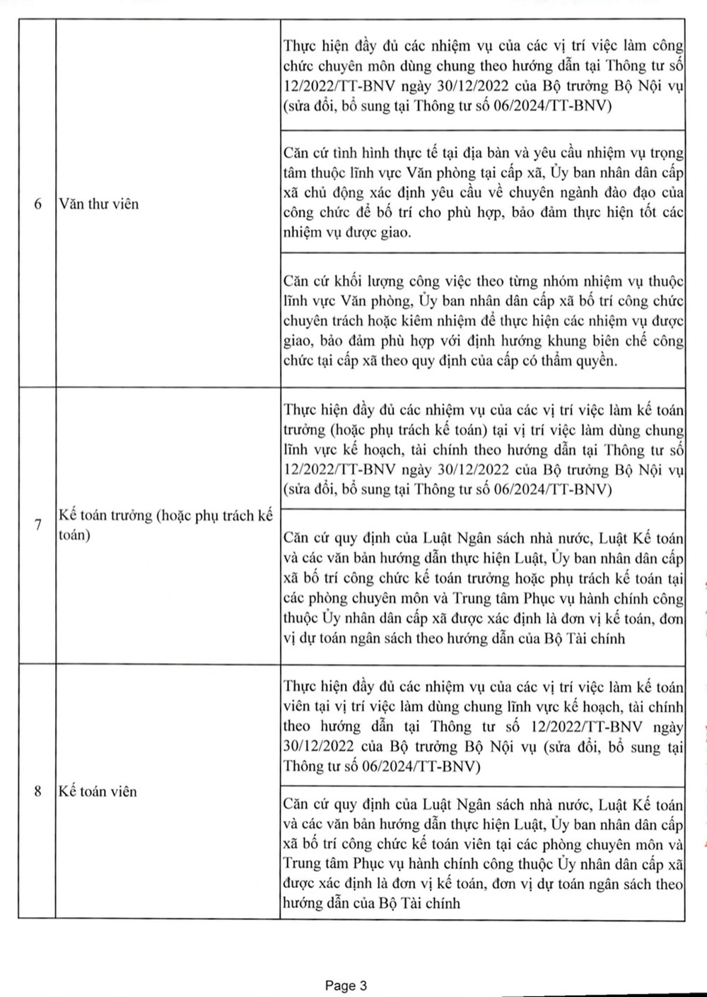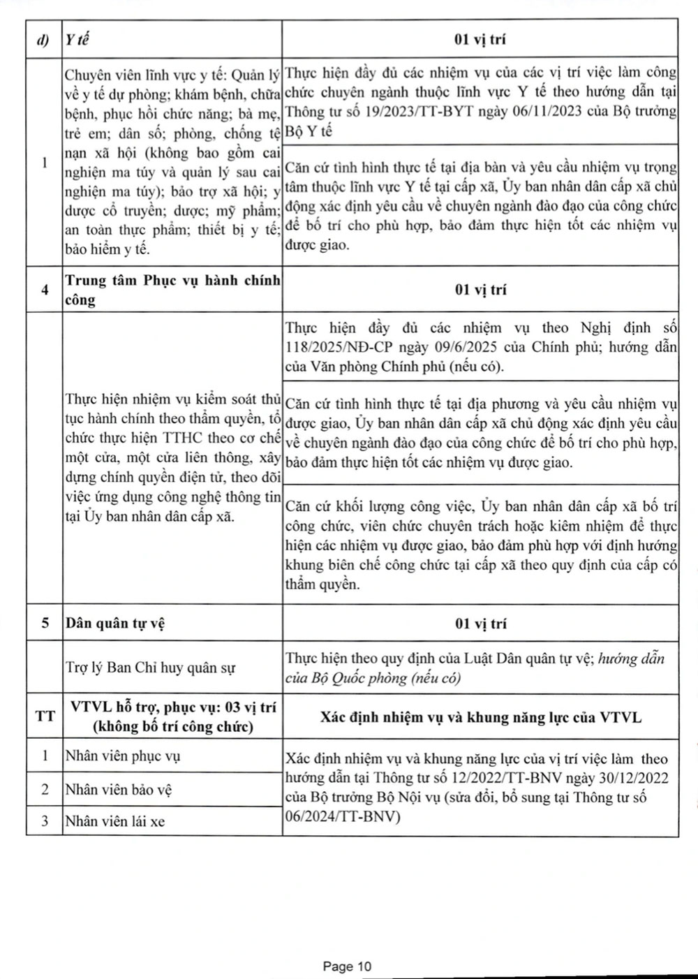 Như vậy, vị trí việc làm sử dụng tại cấp xã là 43 vị trí (bao gồm 8 vị trí lãnh đạo, quản lý; 32 vị trí chuyên môn, nghiệp vụ bố trí theo ngành, lĩnh vực và 3 vị trí việc làm hỗ trợ, phục vụ). Số vị trí này tăng 4 vị trí so với định hướng tại Công văn số 7415/BNV-CCVC.