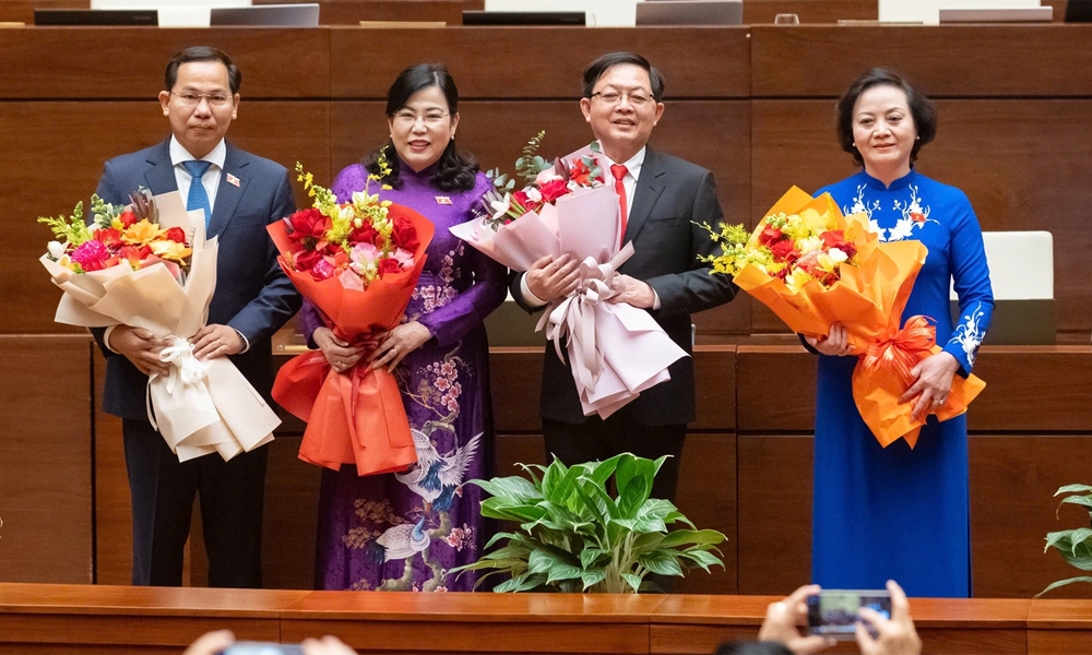 Hai tân Phó Thủ tướng và các nhân sự mới được Quốc hội bầu nhận hoa chúc mừng của lãnh đạo Đảng, Nhà nước. |