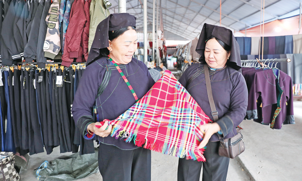Bà Vi Thị Hồng (bên phải), thôn Cầu Nhạc, xã Biên Sơn đi sắm Tết. |