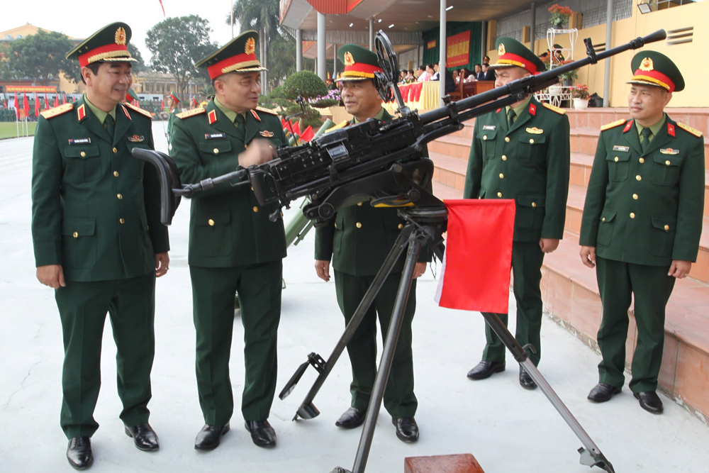 Thượng tướng Nguyễn Văn Hiền, Ủy viên Trung ương Đảng, Thứ trưởng Bộ Quốc phòng và Trung tướng Trương Mạnh Dũng, Tư lệnh Quân khu 1 kiểm tra vũ khí trang bị sẵn sàng chiến đấu tại Trung đoàn 2, Sư đoàn 3. Ảnh: Khương Quang. |