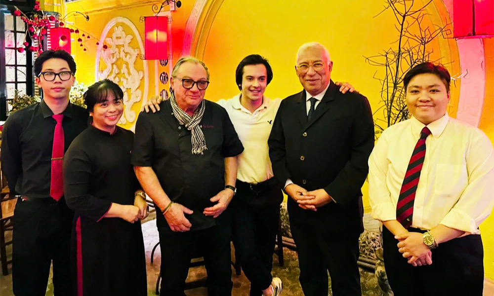 Ông Antonio Costa (thứ hai từ phải sang) chụp ảnh cùng chủ nhà hàng (quàng khăn) và nhân viên. |