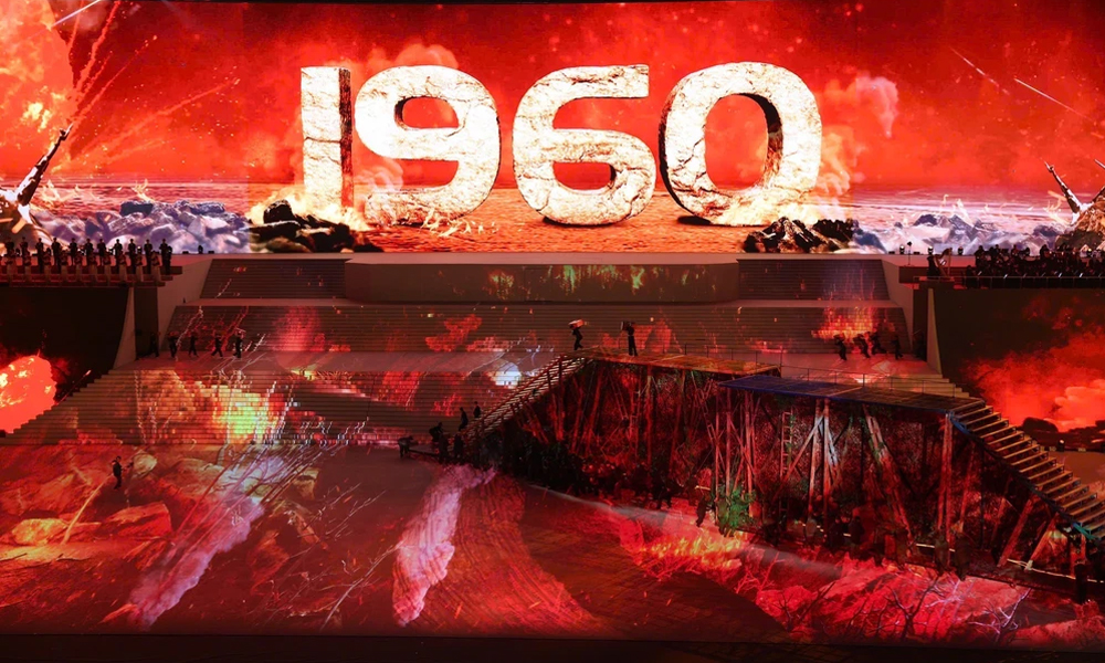 Trong không khí trang nghiêm, xúc động, lá cờ đỏ sao vàng được rước trang trọng vào lễ đài, đội hình rước cờ tiến lên sân khấu, nghi thức chào cờ thiêng liêng trở thành điểm nhấn, mở đầu phần nghi lễ của chương trình.