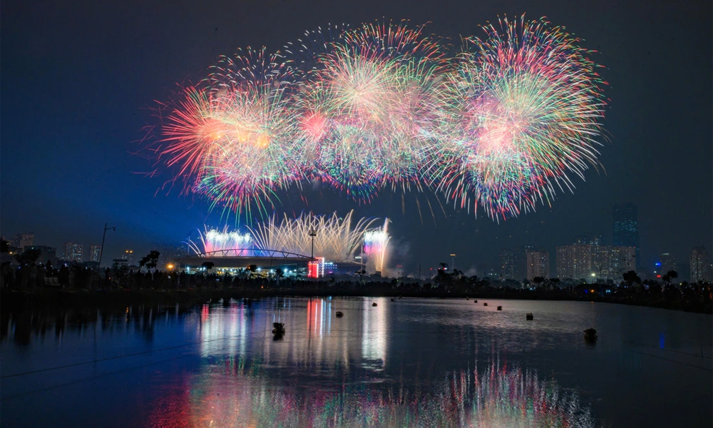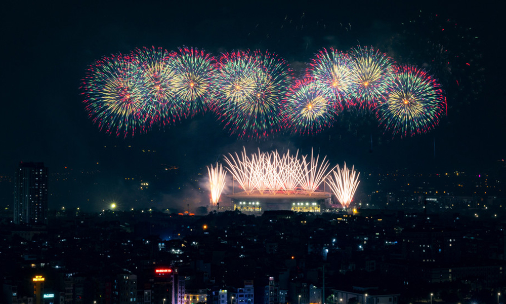 Pháo hoa thắp sáng bầu trời Hà Nội. |