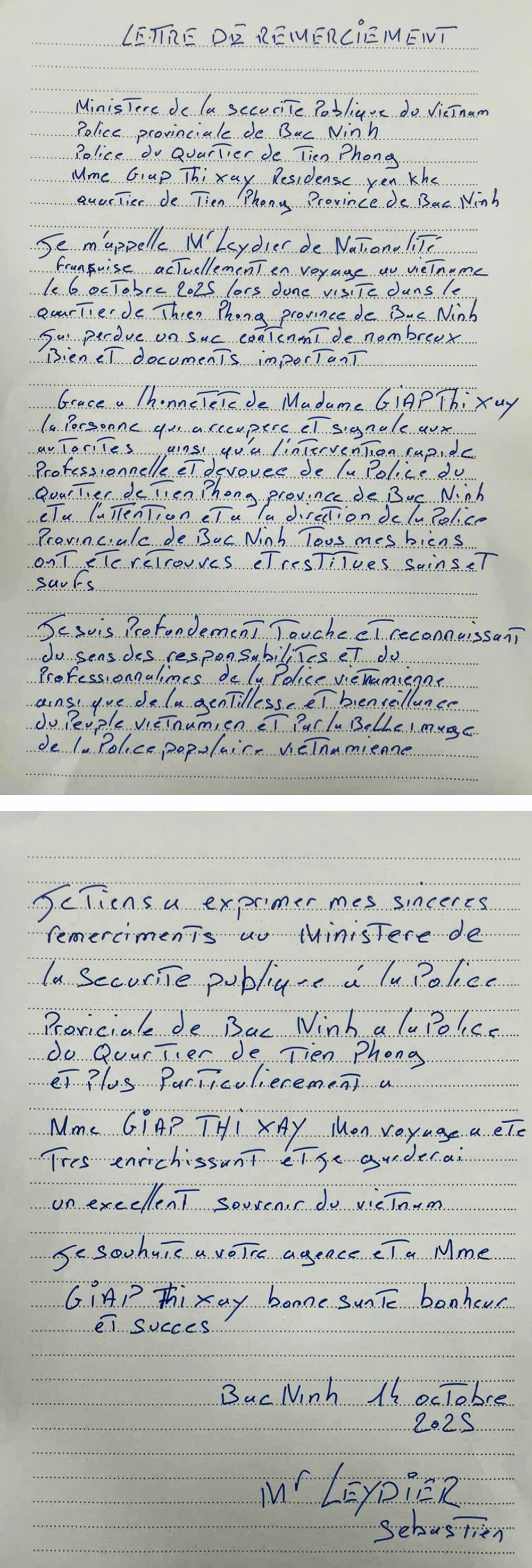 Ông Leydier Sebastián Michel Andre Paul đã xúc động viết thư cảm ơn Công an phường Tiền Phong, Phòng Quản lý xuất nhập cảnh (Công an tỉnh Bắc Ninh).