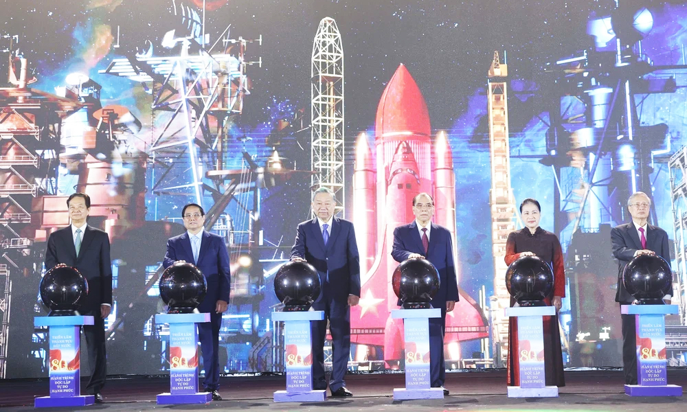 Tổng Bí thư Tô Lâm, Thủ tướng Phạm Minh Chính cùng các đồng chí Lãnh đạo, nguyên Lãnh đạo Đảng, Nhà nước thực hiện nghi thức khai mạc Triển lãm thành tựu Đất nước. |