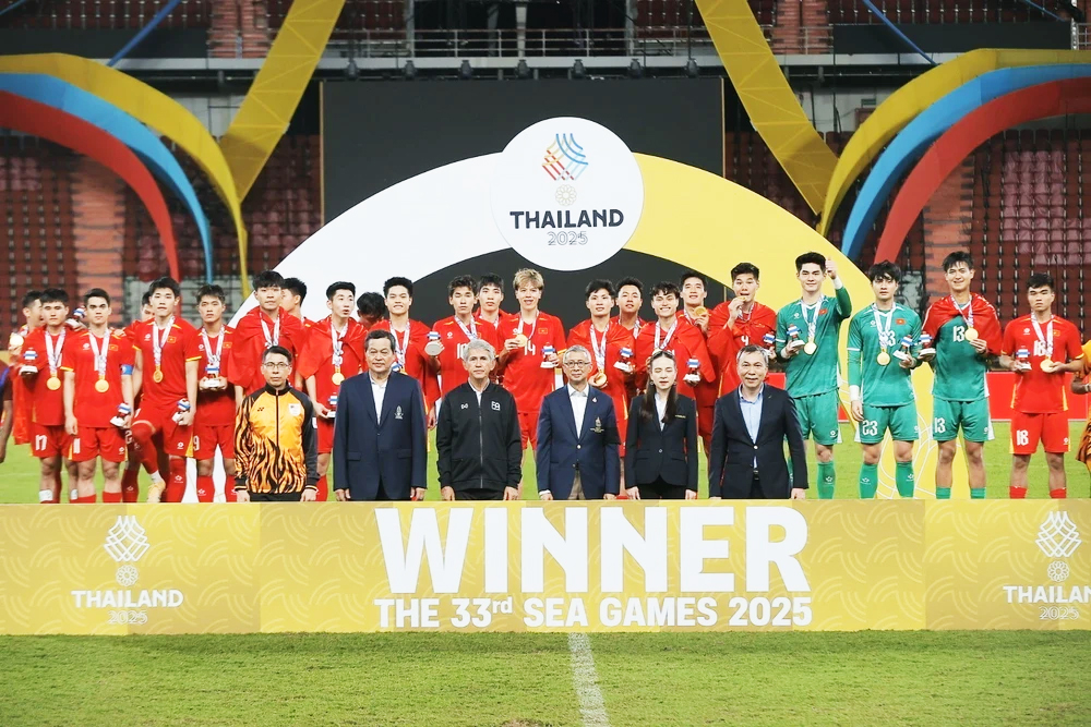 Các cầu thủ U22 Việt Nam nhận Huy chương Vàng SEA Games 33. |