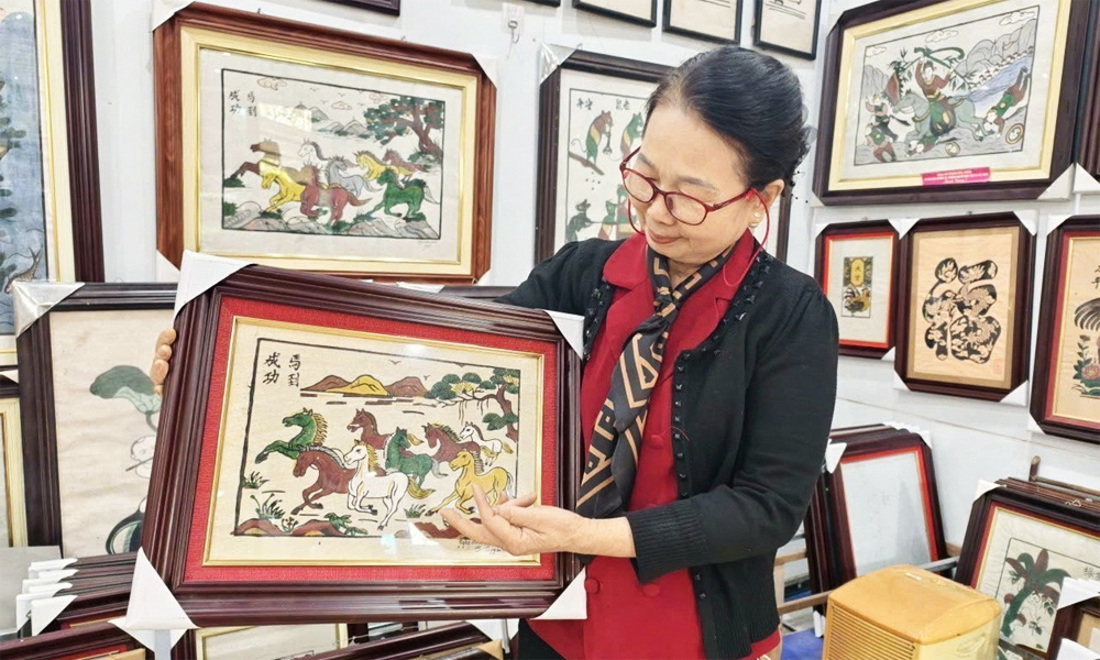 Nghệ nhân Ưu tú Nguyễn Thị Oanh giới thiệu sản phẩm tranh dân gian Đông Hồ. |