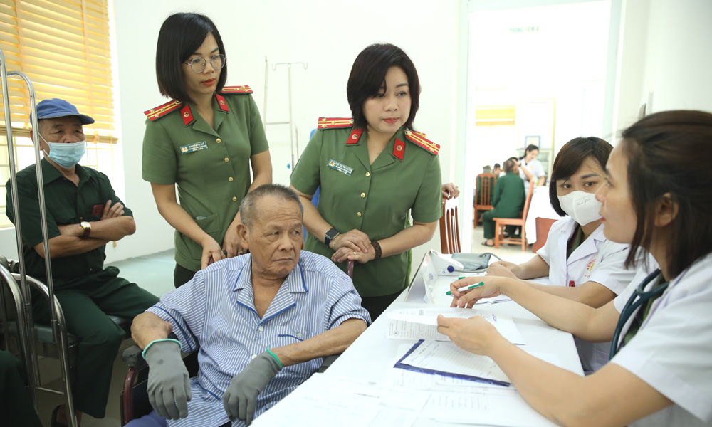 Cán bộ, y bác sĩ đoàn công tác khám, tư vấn sức khỏe cho các thương, bệnh binh. |