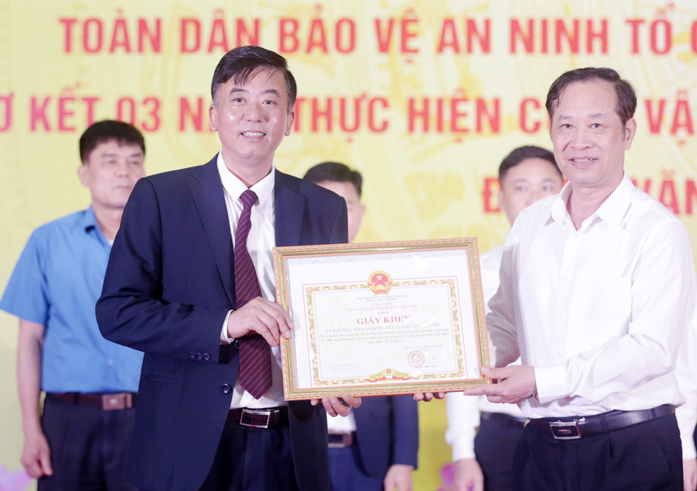 Lãnh đạo Ủy ban MTTQ tỉnh trao Bằng khen cho Ủy ban MTTQ thị xã Việt Yên về thành tích 20 năm tổ chức Ngày hội đại đoàn kết toàn dân tộc. |