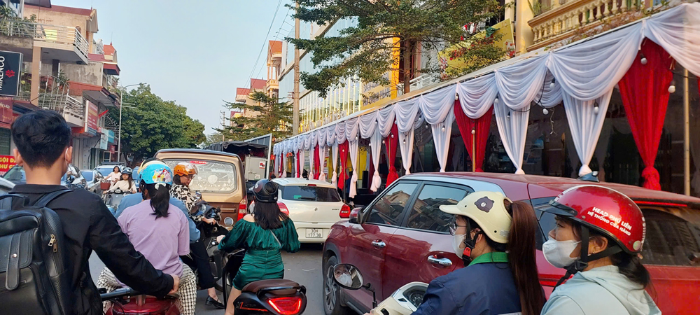 Phương tiện gặp khó khi lưu thông qua đường Nguyễn Thị Lưu (phường Bắc Giang) do có rạp đám cưới. Ảnh chụp chiều 21/12/2025.
