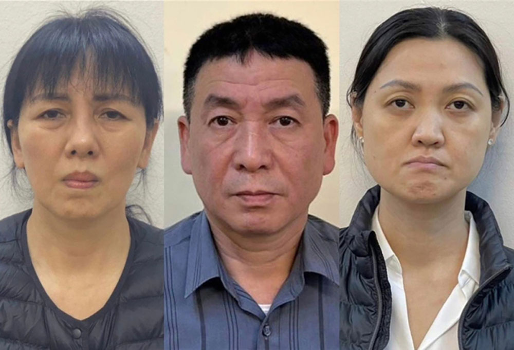 Bị can Nguyễn Thị Thanh Thủy, Đinh Quốc Khánh và Tô Mỹ Ngọc (từ trái qua) lúc bị bắt. Ảnh: Bộ Công an. |