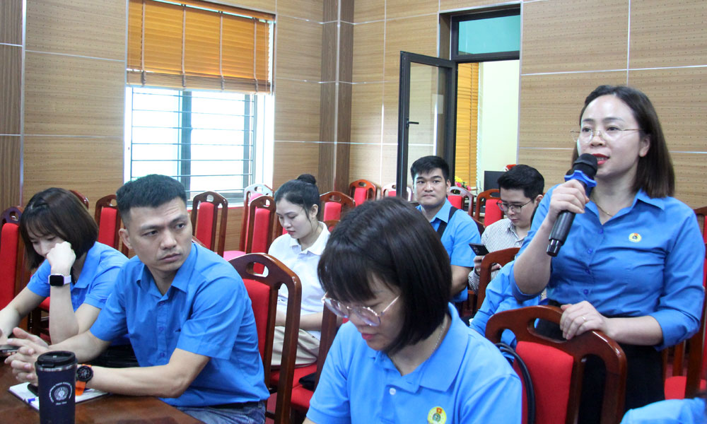 Đại diện công đoàn cơ sở trao đổi một số nội dung liên quan đến Đại hội Công đoàn. |