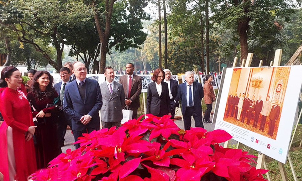 Đại sứ Đặc mệnh toàn quyền Liên bang Nga tại Việt Nam Bezdetko Gennady Stepanovich (thứ ba từ trái sang) tham quan triển lãm "Chủ tịch Hồ Chí Minh và Liên bang Nga." |